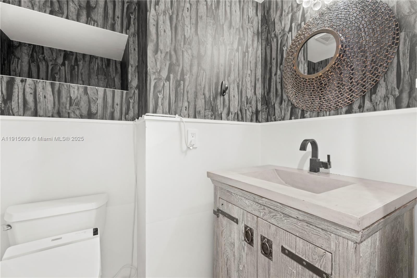 The home features soaring volume ceilings that fill the space with natural light, along with impeccable finishes throughout. Quartz countertops, designer wallpaper, custom mirrors, and porcelain tile create a luxurious, modern aesthetic. An exclusive outdoor area is perfect for entertaining guests and further enhances the appeal of this elegant residence.