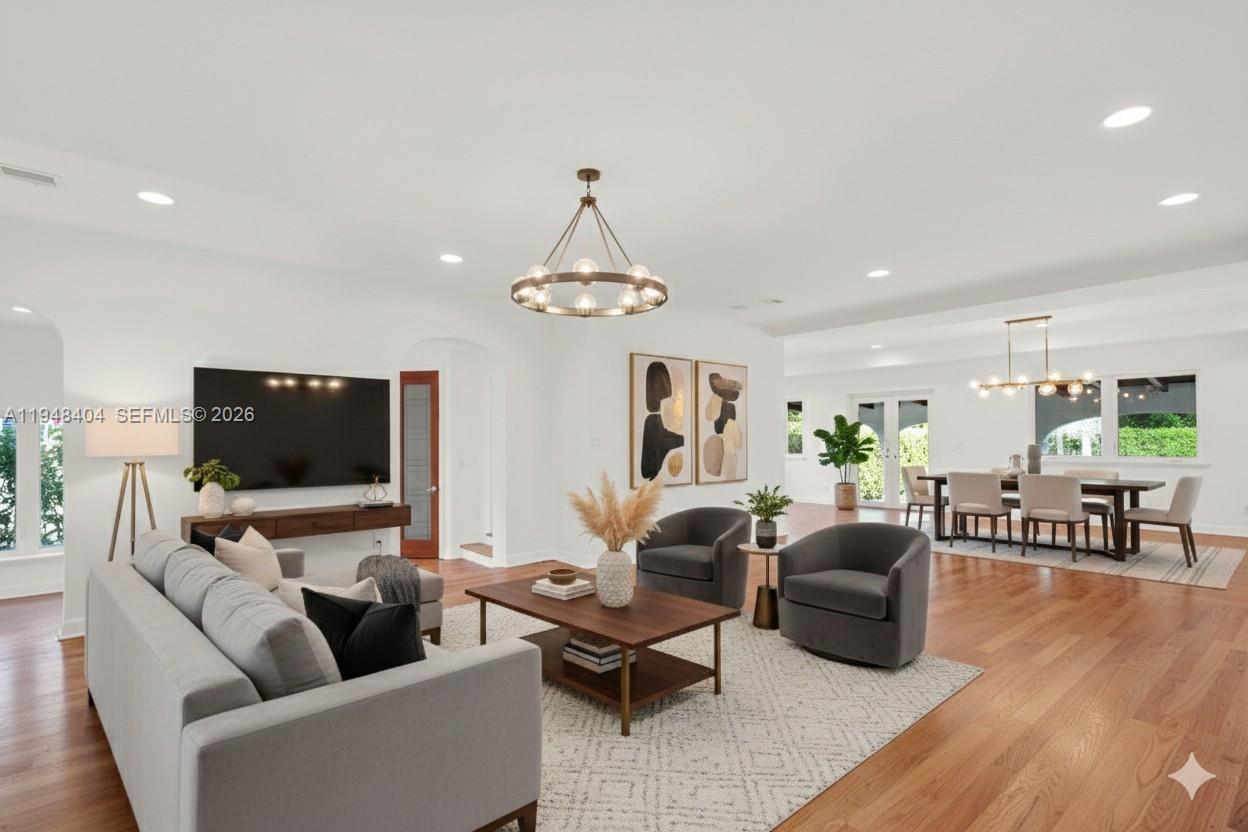 This home opens with a palm-lined paver driveway and timeless 1930s architecture. Inside, you’ll find bright, open living areas with arched walkways, high ceilings, and hardwood floors throughout. Recessed lighting and clean lines give a modern touch while preserving historic appeal.